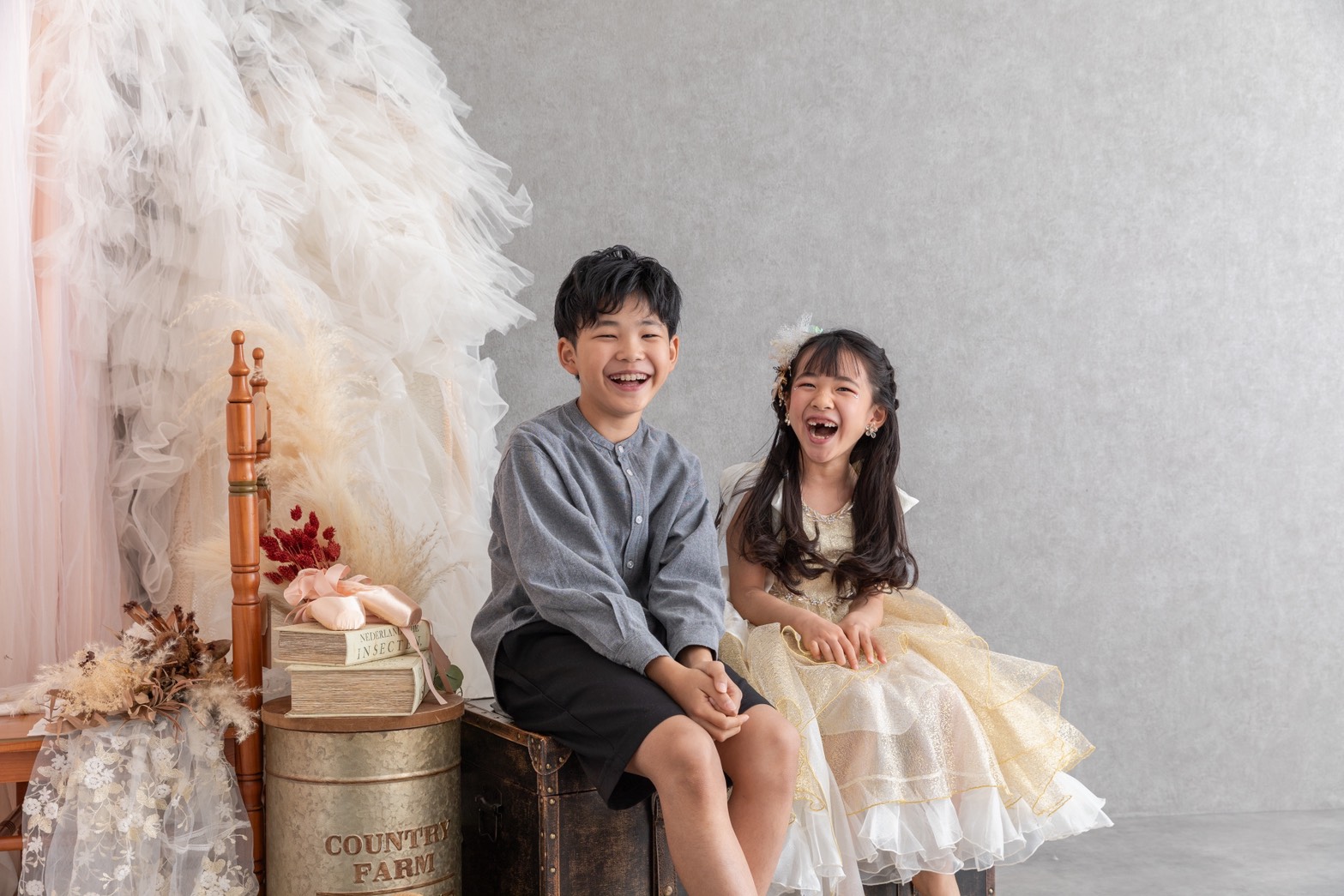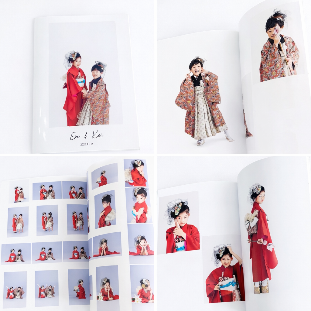 撮影データ 100カット / メインのお子さま衣装、着付け、ヘアセット、小物一式付き / アシスタント1名付き / オリジナルフォトブック付き